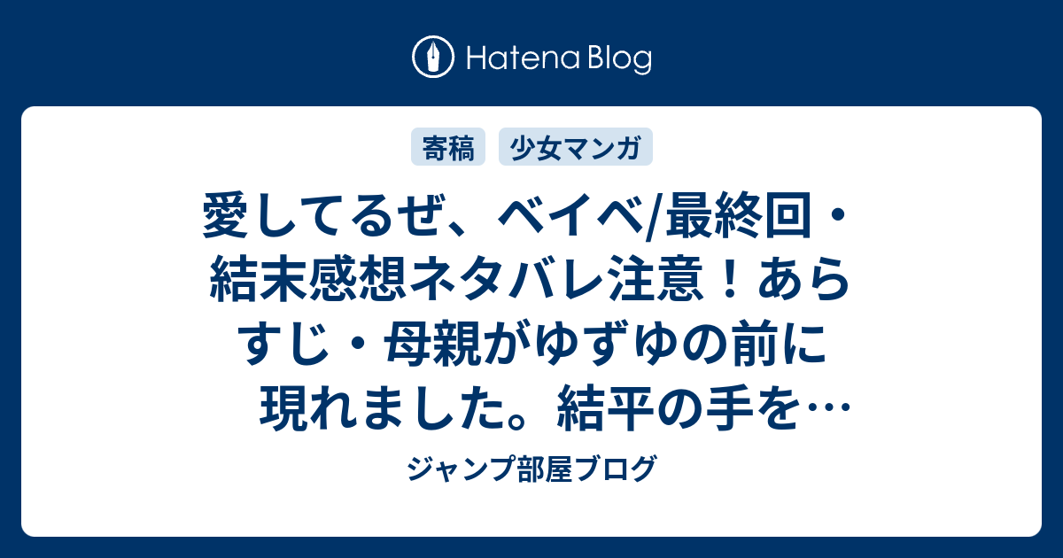 Mixi愛してるぜベイベ★★ 最終巻で・・・★ ゆずゆが大きく なってきっぺぇに お礼のお手紙を だして、ゆずゆが ママとくらしてマス よね??! で、最後手紙が おわってゆずゆが ママに『しょう ちゃんきたわょー』 ッてゆうんだけど しょうちゃんゆき真白 漫画に埋もれて暮らしたい 『愛してるぜベイベ★★』の見所を最終回までネタバレ紹介! 無料で読める! 更新:2161 女の子が大好きで遊び人な高校生・片倉結平(かたくらきっぺい)は、実家で預かることになった従姉妹・ゆずゆの面倒を 愛してるぜベイベのテーマ曲は26話を通して変わらず、一青窈さんが歌う2曲となっています。 ・OP(オープニングテーマ)「sunny side up」:一青窈 ・ED(エンディングテーマ)「年年歳歳」:一青窈 愛してるぜベイベの口コミ・感想をご紹介
